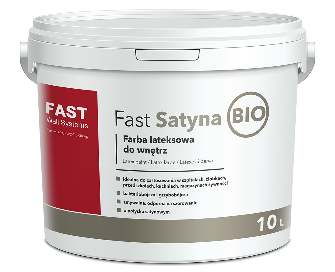 Wysokiej jakości, nawierzchniowa farba lateksowa FAST SATYNA BIO przeznaczona jest do wykonywania ochronnych i dekoracyjnych powłok malarskich wewnątrz budynków. FAST SATYNA BIO może być stosowana na wszelkiego typu podłoża mineralne, jak beton, tynki cementowe, cementowo-wapienne, wapienne i gipsowe oraz płyty kartonowo-gipsowe oraz powierzchnie pokryte powłoką na bazie dyspersji polimerowej. Stosowana zarówno do malowania pierwotnego, jak i renowacyjnego na podłożach o jednolitej bądź zmiennej strukturze i barwie.