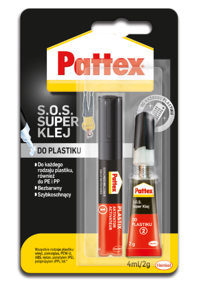 Pattex S.O.S. Super Klej do plastiku jest błyskawicznym klejem do każdego rodzaju plastiku, nawet polietylenu (PE) i polipropylenu (PP). Klej oferowany jest w dwuczęściowym zestawie, na który składa się aplikator w długopisie oraz tubka z klejem.